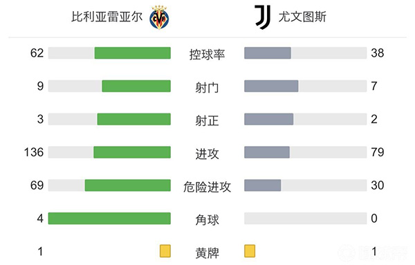 全场比赛结束,尤文图斯客场1-1战平比利亚雷亚尔。