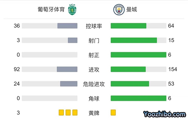 全场比赛结束,曼城客场5-0大胜葡萄牙体育。