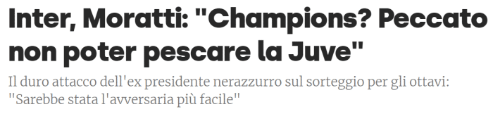 直播车12月11日讯据意大利媒体《罗马体育报》报道,国米前主席莫拉蒂在接受采访时表示,欧冠进入到淘汰赛,只有尤文是容易的对手。