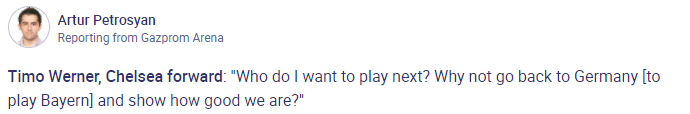 维尔纳说道:“16强我想碰到谁?为什么不回去德国(踢拜仁)并展示我们有多强呢?”