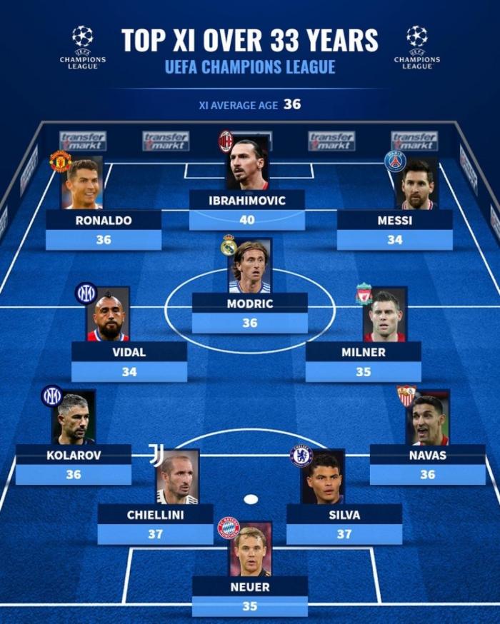 德转盘点欧冠33岁以上和U21最佳阵容:哪套阵容更强?