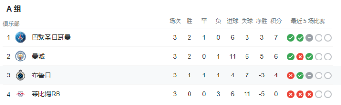 A组方面,巴黎3战2胜1平7分排第一,曼城3战2胜1负6分第二,布鲁日4分第三,莱比锡3战全负0分垫底。