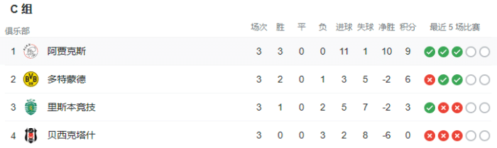 C组阿贾克斯3战全胜进11球只丢1球,9分领跑。多特蒙德今天经历惨败后6分排第二,葡萄牙体育3分第三,贝西克塔斯0分垫底。