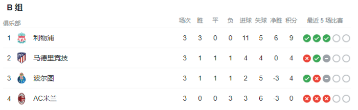 B组,利物浦客场力克马竞,3战全胜9分领跑。马竞和波尔图同积4分分列二三,米兰三战全负0分垫底。