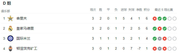 D组,首次参加欧冠的谢里夫6分领跑,皇马同积6分因胜负关系排第二,国米4分排第三,矿工1分垫底