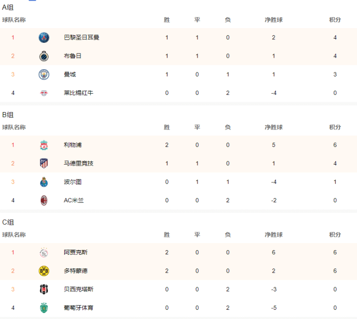 来源:直播车09-30 11:20直播车9月30日讯 ,欧冠小组赛第二轮全部完赛,各大豪门状态不一,A组的巴黎圣日耳曼2-0完胜曼城、布鲁日2-1击败莱比锡;B组的利物浦5-1大胜波尔图、马竞2-1击败AC米兰;C组的阿贾克斯2-0击败贝西克塔斯、多特蒙德1-0击败葡萄牙体育;D组的蒂拉斯波尔警长2-1击败了皇马、国米0-0踢平顿涅茨克矿工;E组的拜仁5-0大胜基辅迪纳摩、巴萨0-3输给本菲卡。