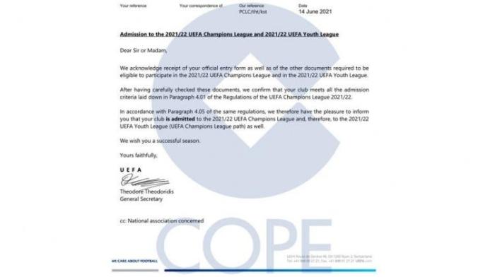 科贝电台曝光了这份文件,欧足联在文件中明确写道:“在仔细检查了你们提交的所有文件后,我们确认贵俱乐部符合2021-22赛季欧冠规定中的所有准入标准。我们祝你取得一个成功的赛季。”
