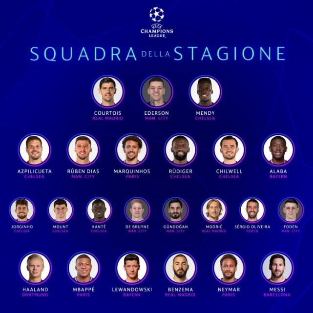 作为本赛季欧冠冠军,切尔西无疑是欧足联评选的欧冠赛季最佳23人阵容的“大赢家”。门迪、阿兹皮利奎塔、吕迪格、奇尔韦尔、芒特、若日尼奥、坎特等7人入选。亚军曼城则有埃德森、迪亚斯、福登、德布劳内、京多安等5人入选。