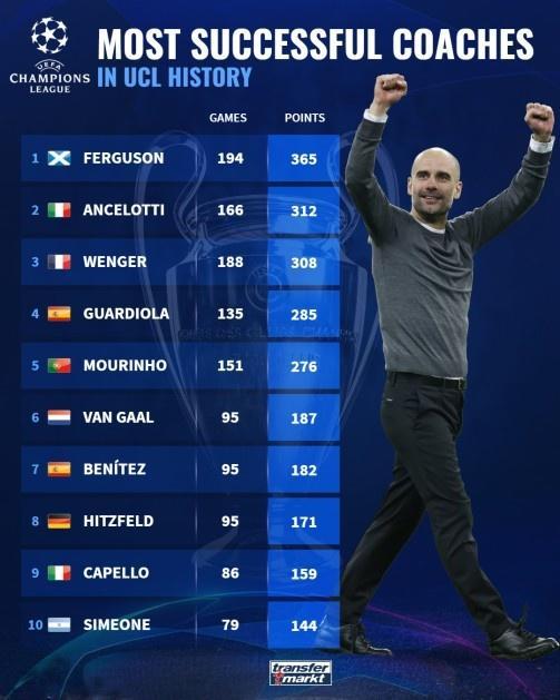 欧冠最成功主帅榜: 弗格森榜首, 穆里尼奥第五