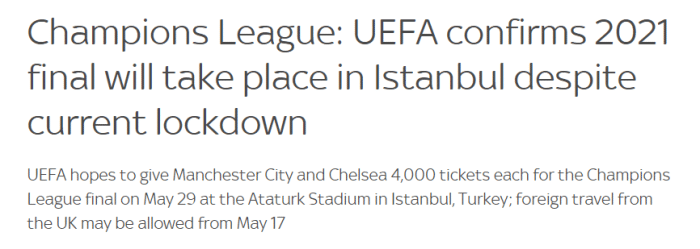 虽然土耳其国内在疫情期间进行了封锁,但欧足联确认5月29日的欧冠决赛依然会在伊斯坦布尔的阿塔图克球场进行。温布利球场因为在同一天举办英冠升级附加赛,无法举办欧冠决赛。