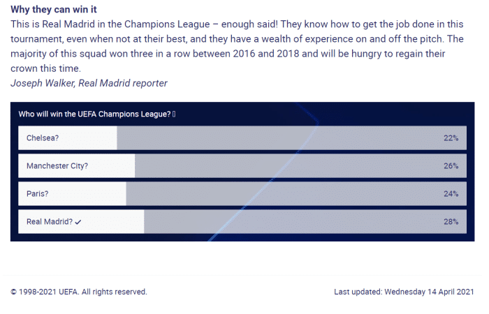 欧足联点评欧冠四强并发布调查:谁能夺得欧冠?曼城得票仅第二!