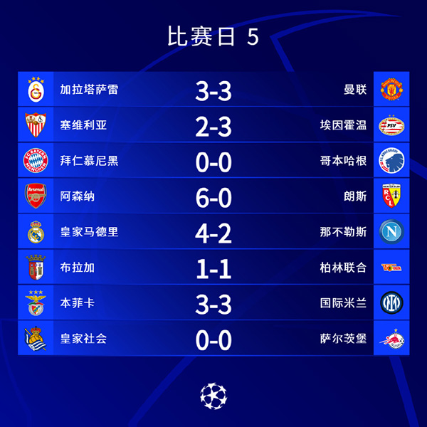A组方面,已经提前锁定头名出线的拜仁,在主场0-0战平哥本哈根。而曼联则在客场3-3被加拉塔萨雷队逼平。5轮过后,哥本哈根和加拉塔萨雷同积5分,曼联积4分垫底,3队末轮将为小组第2的出线资格,展开决战。