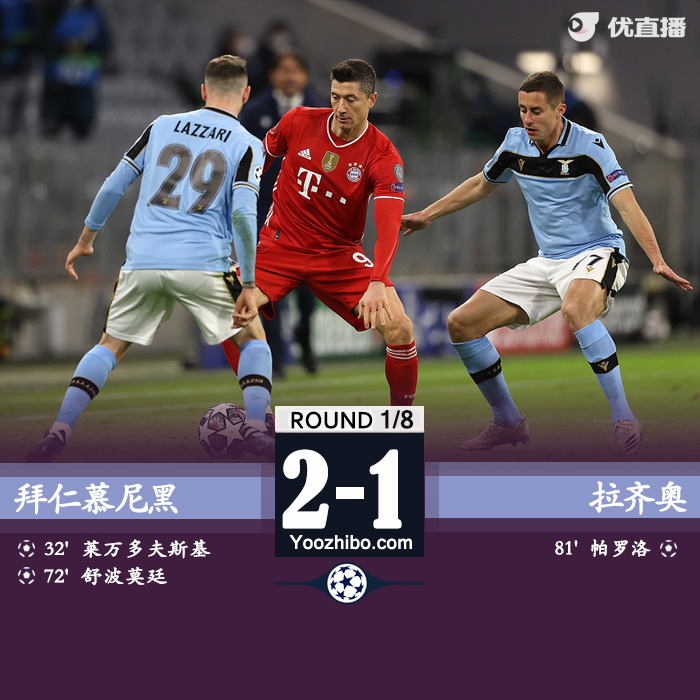 全场比赛结束,拜仁慕尼黑2-1拉齐奥,总比分拜仁6-2拉齐奥晋级欧冠八强。