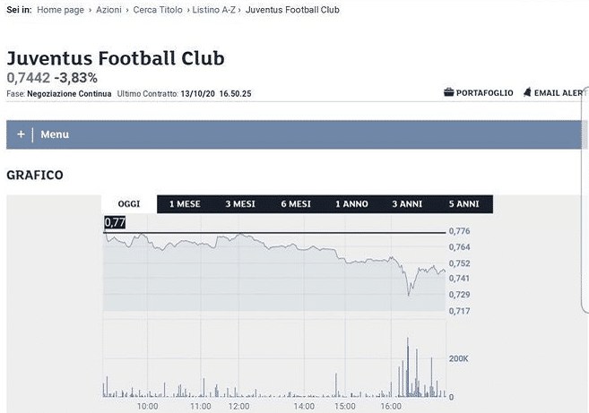事实也确实是这样的,尤文图斯这些年因为人员变动、战绩波动使得他们的股价变化也非常大。去年年底,尤文图斯的当家球星C罗确诊的消息引发巨大的关注度,而尤文图斯的股价也闻声下降,股价随即下跌6.9%;