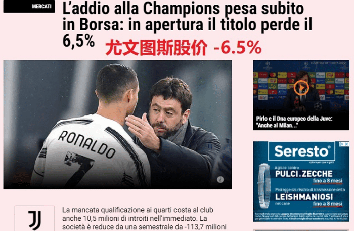 股价暴跌6.5%!尤文欧冠出局影响巨大,C罗和皮尔洛备受质疑