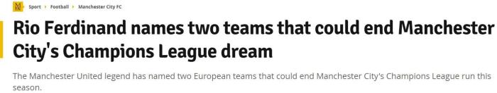 直播车2月25日讯 北京时间2月25日,曼城在欧冠1/8决赛首回合2-0战胜门兴,取得各项赛事19连胜。赛后,曼联名宿费迪南德表示,拜仁和巴黎是最有可能和曼城争夺欧冠冠军的。