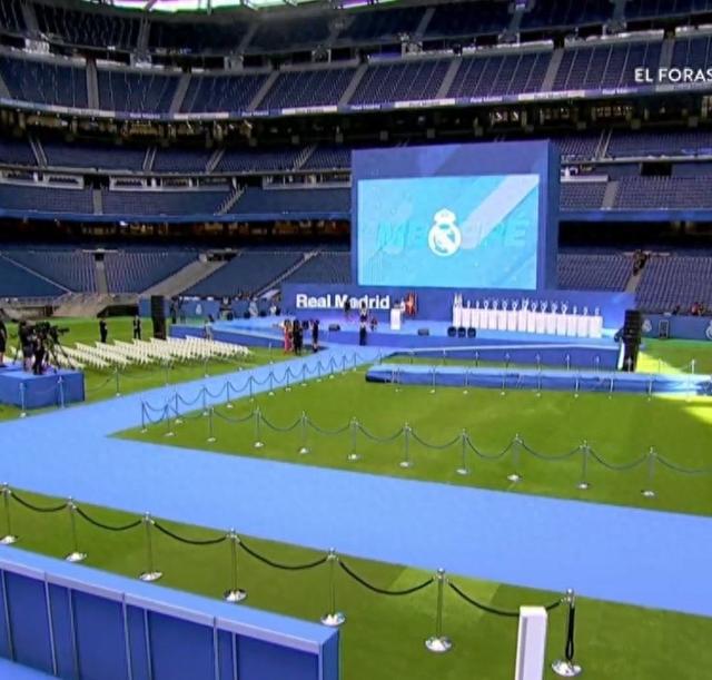 根据现场最新的消息,从伯纳乌球场最新的搭建情况来看,可以看到皇马将在姆巴佩的亮相台上展示俱乐部获得的15座欧冠冠军奖杯。