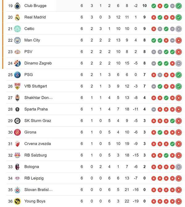 上半区激烈,下半区同样也颇有看点。两大夺冠热门皇马和曼城分别积9分和8分排名第20和第22位,两队大概率无缘直通,被迫要去踢附加赛。