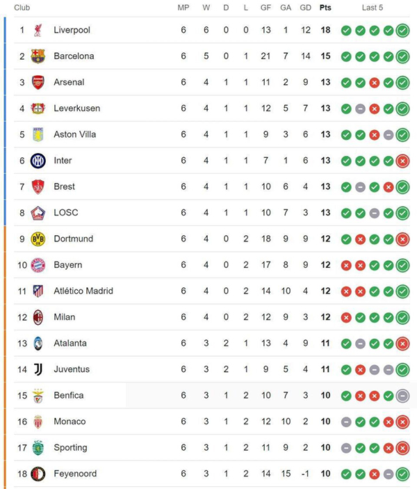 6轮后,利物浦堪称“一枝独秀”,全胜积18分强势领跑,提前2轮锁定直通16强的资格。未来2轮,红军可以“坐山观虎斗”。而巴萨在开门黑后豪取5连胜强势反弹,逆袭至积分榜第2位,直通16强的形势也十分乐观。