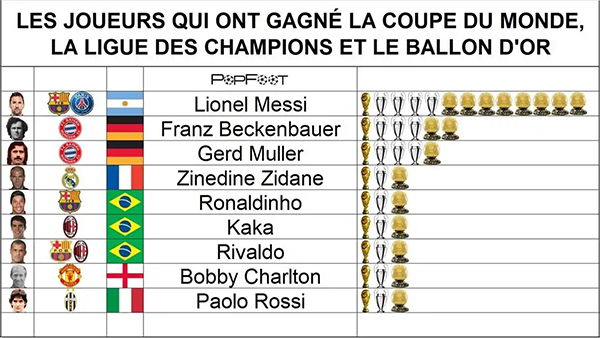 直播车讯 国外数据博主晒图统计获得过世界杯+欧冠+金球奖的球员,具体如下: