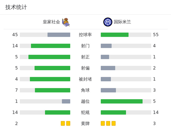 全场比赛结束,最终国米1-1皇家社会。