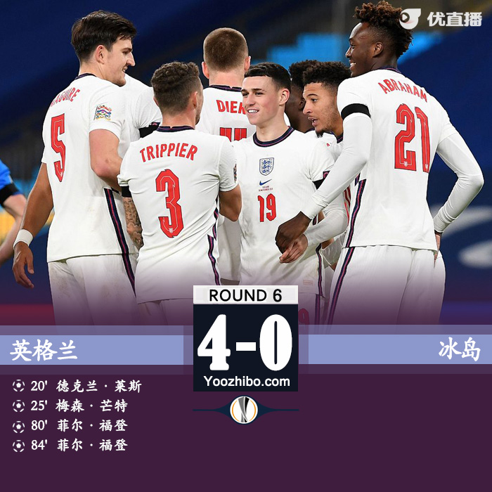 直播车讯:北京时间11月19日03:45(英国当地时间18日19:45),2020/21赛季欧国联A组第2小组第6轮一场焦点战在温布利大球场展开争夺,英格兰主场4比0大胜冰岛,莱斯和芒特进球,福登梅开二度。英格兰终结连败,冰岛全负垫底。这是两队第5次交锋,此前英格兰取得2胜1平1负。马奎尔、福登和萨卡轮换出场。