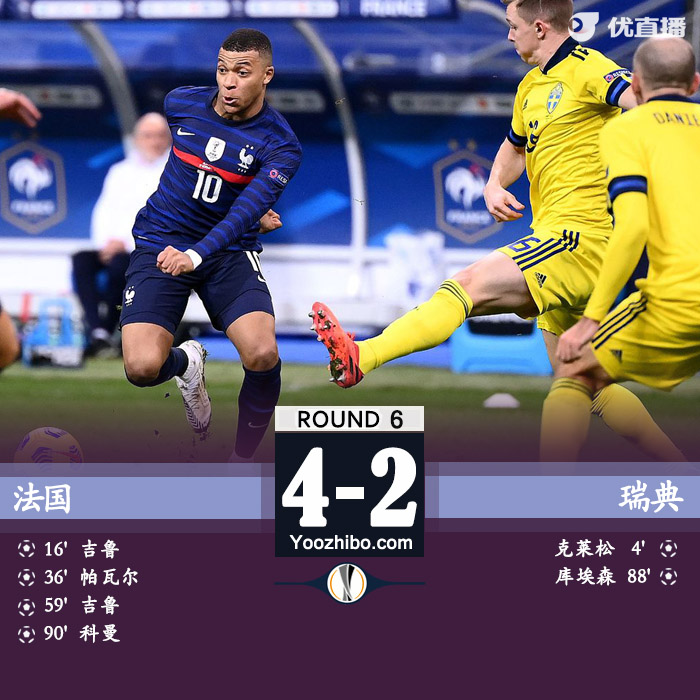 直播车讯:北京时间11月18日03:45(法国当地时间17日20:45),2020/21赛季欧国联A组第3小组第6轮一场焦点战在法兰西大球场展开争夺,法国主场4比2力克瑞典,吉鲁梅开二度,帕瓦尔和科曼进球。法国不败战绩夺得小组头名。