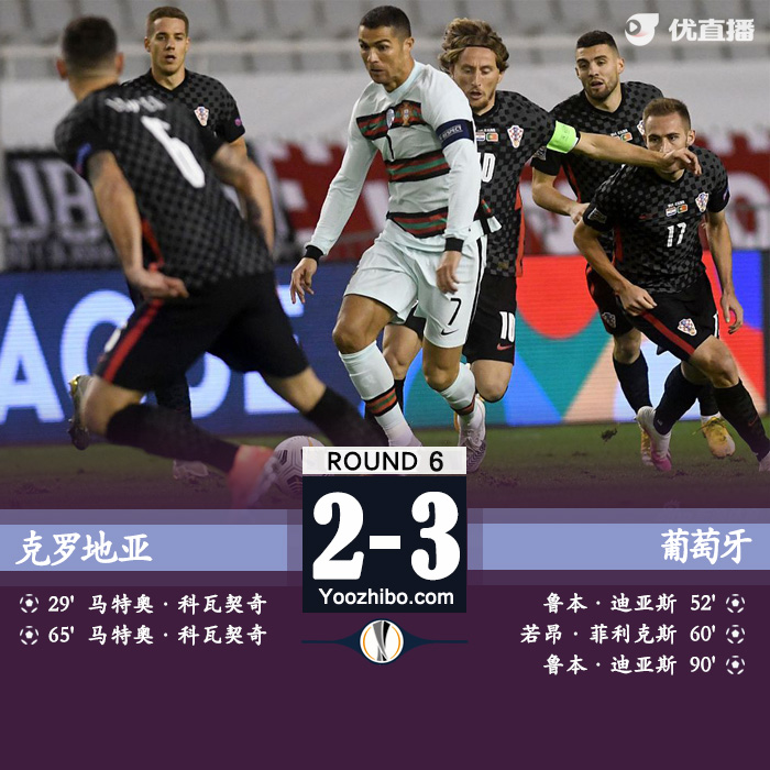 直播车讯:北京时间11月18日03:45(克罗地亚当地时间17日20:45),2020/21赛季欧国联A组第3小组第6轮一场焦点战在波伦德球场展开争夺,葡萄牙客场3比2险胜克罗地亚,科瓦契奇梅开二度,曼城铁闸迪亚斯打入2球,菲利克斯进球。罗格对C罗犯规被罚下。