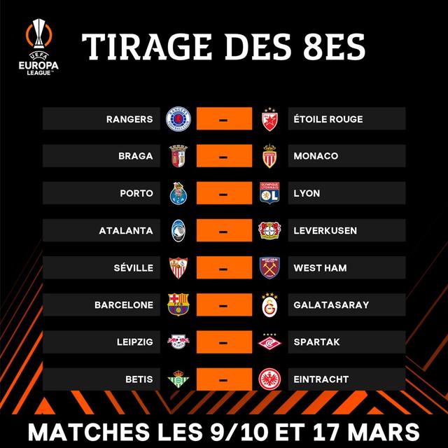 欧联杯1/8决赛对阵出炉——(非种子队在前,前主后客)流浪者(苏超)vs贝尔格莱德红星(塞超)