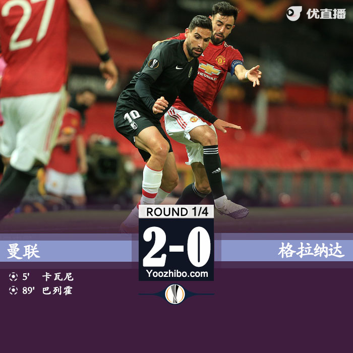 直播车4月16日讯 北京时间4月16日凌晨3:00,20-21赛季欧联杯1/4决赛第二回合继续进行,曼联在老特拉福德主场迎战格拉纳达。上半场,博格巴助攻卡瓦尼抽射破门,曼联1:0暂时领先格拉纳达。下半场补时阶段,巴列霍自摆乌龙。最终曼联主场2:0格拉纳达,曼联两回合总比分4:0轻松晋级四强。