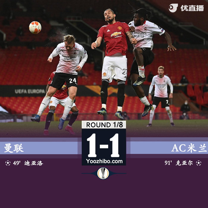 直播车3月12日讯 北京时间3月12日凌晨1:55,20-21赛季欧联杯1/8决赛首回合,曼联主场迎战AC米兰。上半时,莱奥和凯西进球都被吹掉,马奎尔空门机会中柱。下半时B费助攻迪亚洛回头望月破门,丹尼尔-詹姆斯包抄空门踢偏,补时阶段克亚尔头球绝平。最终,曼联1-1AC米兰,双方次回合比赛是3月19日凌晨4点。