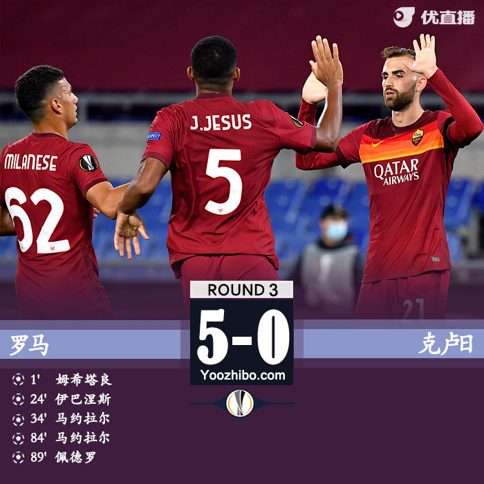 直播车讯:北京时间11月6日凌晨1:55,2020-2021赛季欧联杯小组赛A组第三轮,罗马坐镇主场迎战来访的克卢日。上半时比赛姆希塔良闪击为罗马取得梦幻开局,伊巴涅斯破门,马约拉尔打进加盟首球。下半时比赛库姆布拉门线救险,随后马约拉尔再下一城,佩德罗替补建功锦上添花。最终,罗马主场5-0大胜克卢日,成功登上A组积分榜榜首。