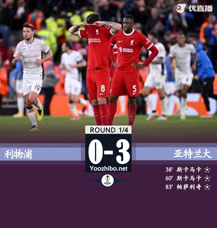 来源:直播车04-12 09:47 直播车讯:北京时间4月12日欧联 1/4决赛首回合,利物浦主场对阵亚特兰大。开场凯莱赫神级扑救,努涅斯丢单刀,埃利奥特中框,斯卡马卡禁区推射破门,下半场斯卡马卡梅开二度,萨拉赫破门被吹,帕萨利奇锁定胜局。最终比分利物浦 0-3 惨败亚特兰大。