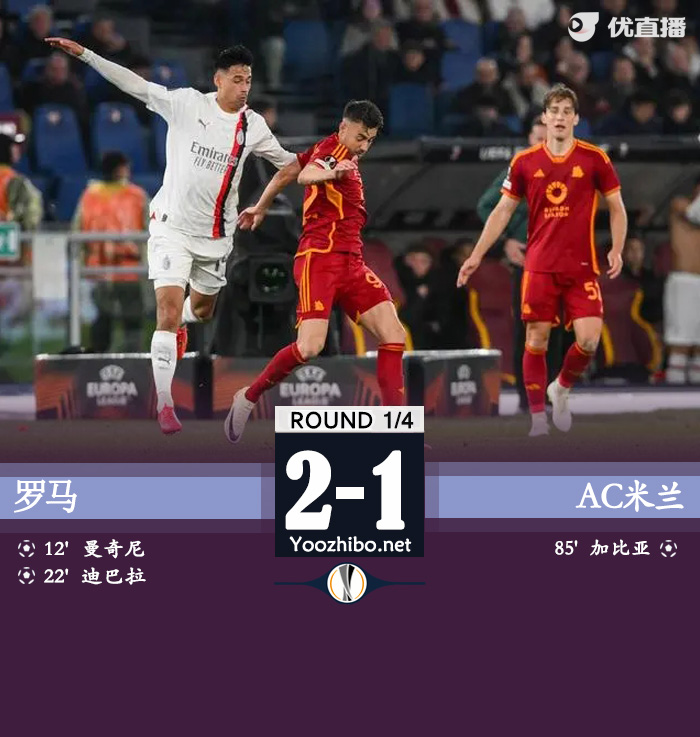 来源:直播车04-19 06:06 直播车讯:北京时间4月19日欧足联欧洲联赛 1/4决赛次回合,罗马主场对阵AC米兰。上半场,佩莱格里尼远射中柱后曼奇尼机敏补射破门,奇克凌空扫射击中横梁,迪巴拉兜射入网扩大比分,卢卡库有些受伤被换下场,切利克铲球蹬到莱奥脚后跟被直红罚下;下半场,斯皮纳佐拉推射被挡,赖因德斯远射被托出横梁,莱奥助攻加比亚头球破门扳回一个,丘库埃泽内切兜射被扑。最终比分罗马2-1AC米兰。两回合总比分罗马3-1AC米兰。
