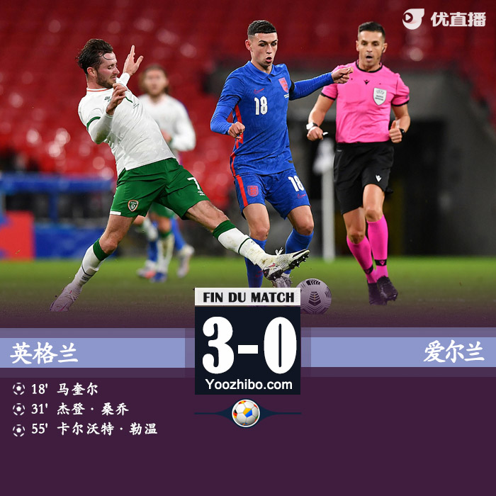 易边再战,索斯盖特换门将,亨德森顶替波普出战。第47分钟,禁区内左侧格拉利什闪转腾挪搓射打偏。第50分钟,外围格拉利什直塞,里斯-詹姆斯脚底板巧做,萨卡前插捅偏。第52分钟,左路萨卡下底挑传,门前勒温头槌顶歪。第54分钟,英格兰获点!左侧禁区线萨卡突破克里斯蒂时倒地,主裁果断判点!第56分钟,英格兰第3球!勒温!助跑打左上,骗过门将!英格兰3-0爱尔兰!