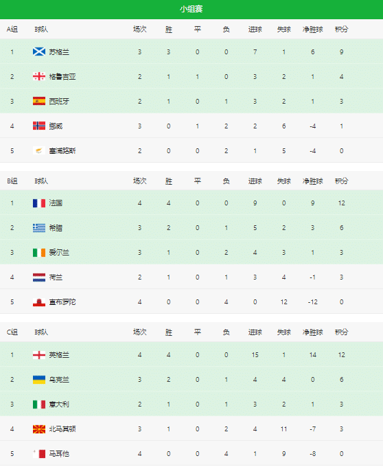 A组的格局,苏格兰队3连胜开局,占据明显优势。西班牙队虽然位居第三名,但刚刚夺得欧国联的斗牛士军团直通的希望还是很大的。B组的法国队3连胜一骑绝尘,希腊2胜1负也很不错,荷兰队想要冲击前两名,需要努力了。C组英格兰的实力和状态都要更好,开局4战全胜,意大利队暂时落后乌克兰,但依旧有机会,他们刚刚拿下欧国联的季军。