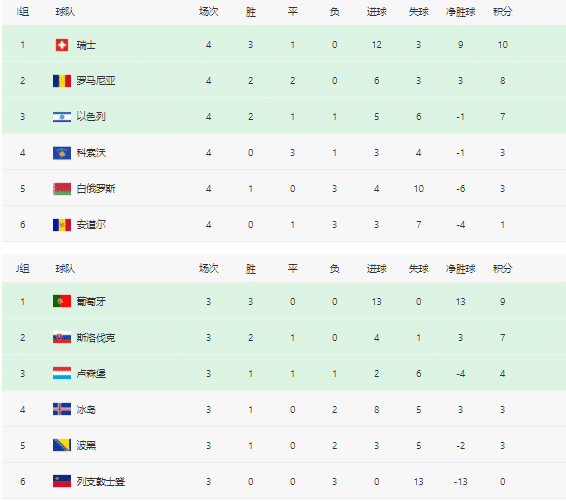 H组的芬兰开局4场比赛拿下9分,表现强势,哈萨克斯坦也是9分的状态,成为本届欧预赛至今的最大黑马,当然身后7分的丹麦和斯洛文尼亚也有机会。I组的格局是瑞士、罗马尼亚和以色列之间的竞争。J组的葡萄牙开局全胜,斯洛伐克也有不俗的表现。