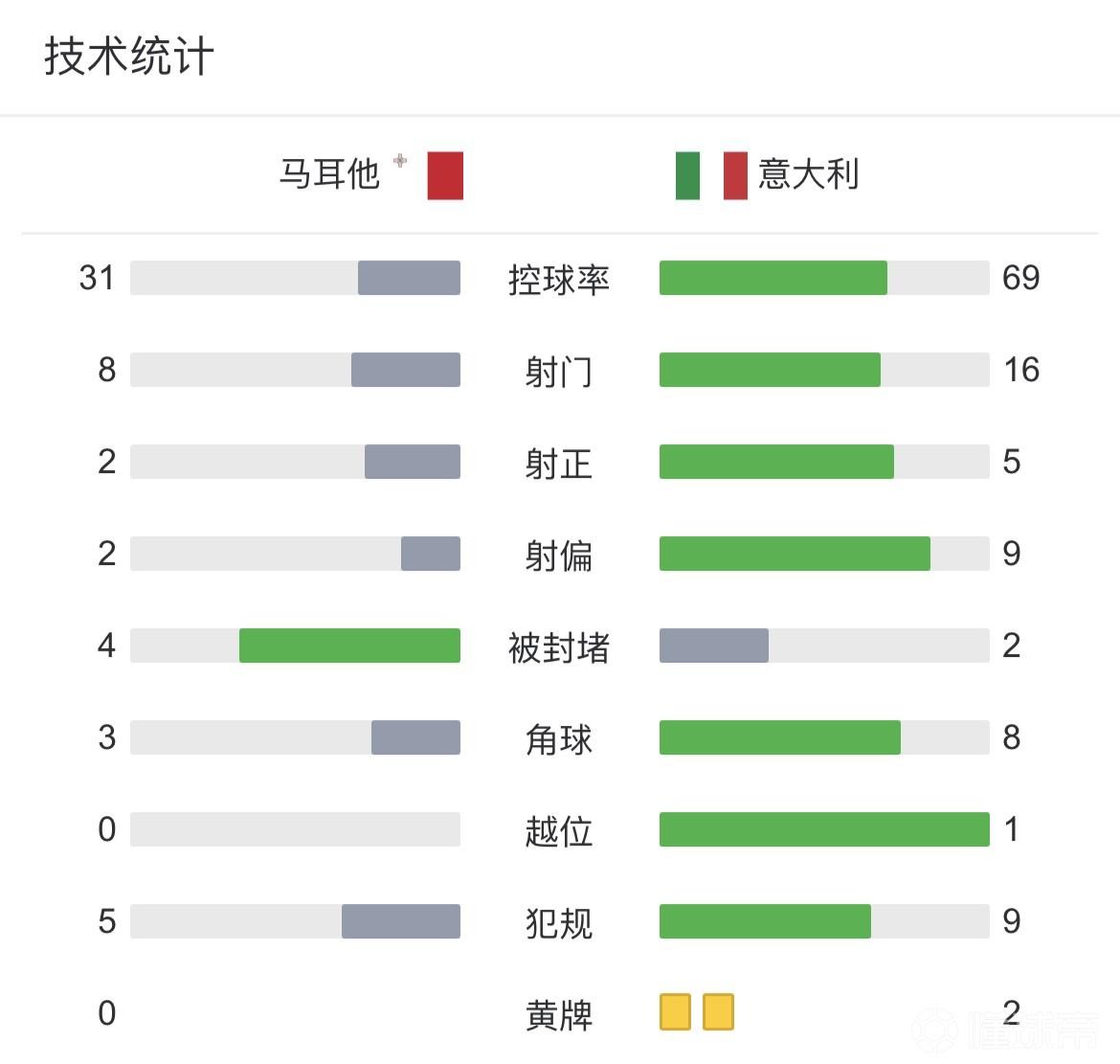 来源:直播车03-27 06:45 直播车讯 :北京时间3月27日凌晨2点45分,欧洲杯预选赛C组第二轮展开一场焦点战役,意大利客场对阵马耳他,本场比赛当值主裁判为乔治。上半场,托纳利角球助攻雷特吉连场破门。随后,尼奥托伤退被格里福换下。埃莫森助攻,佩西纳破门扩大领先优势。下半场,斯卡马卡的精彩倒钩射门被扑出。全场比赛结束,意大利2-0击败马耳他,蓝衣军团迎来欧预赛首胜。