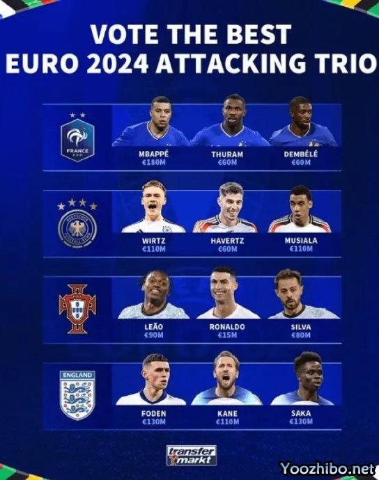 来源:直播车03-31 16:49直播车讯 德国欧洲杯将在今夏举行,《转会市场》也列出了四大强国的前场三叉戟组合,并提问“哪个组合最强?”