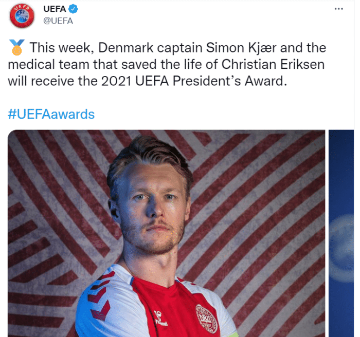 欧足联官方表示,本周,丹麦队长克亚尔以及拯救了埃里克森生命的医疗团队,将获得2021年欧足联主席奖。