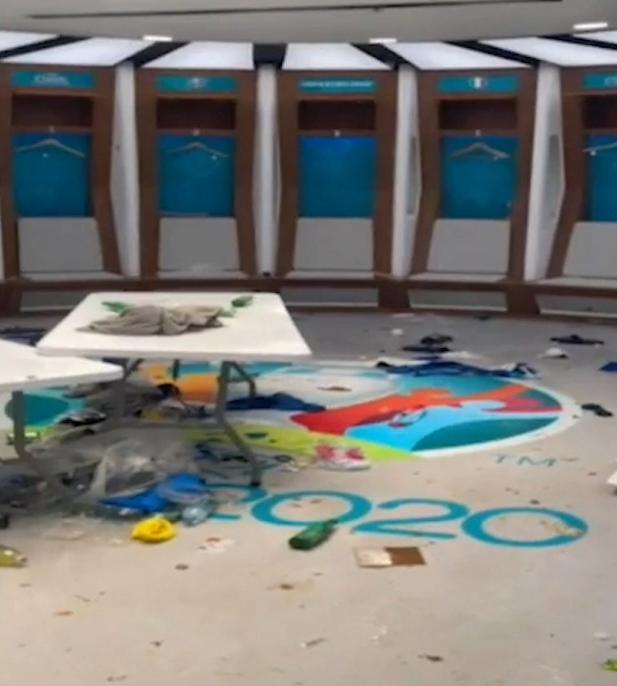 直播车讯 《太阳报》今日曝光了欧洲杯后意大利更衣室的照片,意大利在庆祝完夺冠后将更衣室弄得满地垃圾,并且没有收拾就离开。