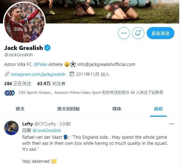 格拉利什本场比赛替补登场,没有建树,他点赞这条推特后又取消了。