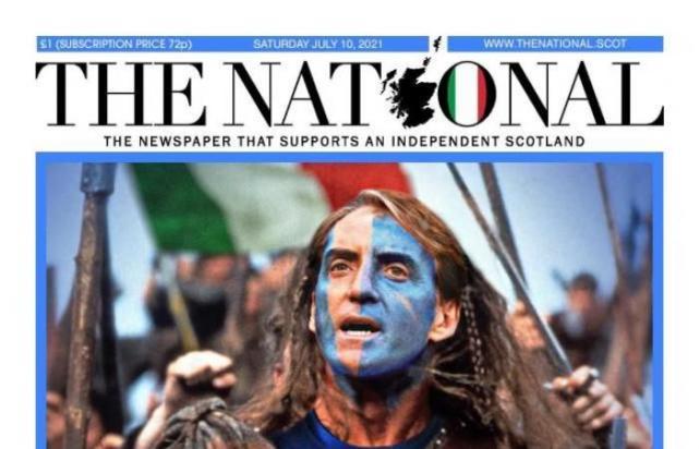 众所周知,尽管苏格兰与英格兰同属英国,但双方是关系非常糟糕的“世仇”。早在欧洲杯决赛前,苏格兰媒体《国家报》就曾表示,苏格兰举国都为意大利加油,希望意大利能阻止英格兰夺冠。《国家报》甚至还在头版封面将意大利主帅曼奇尼,PS成《勇敢的心》的主人公。