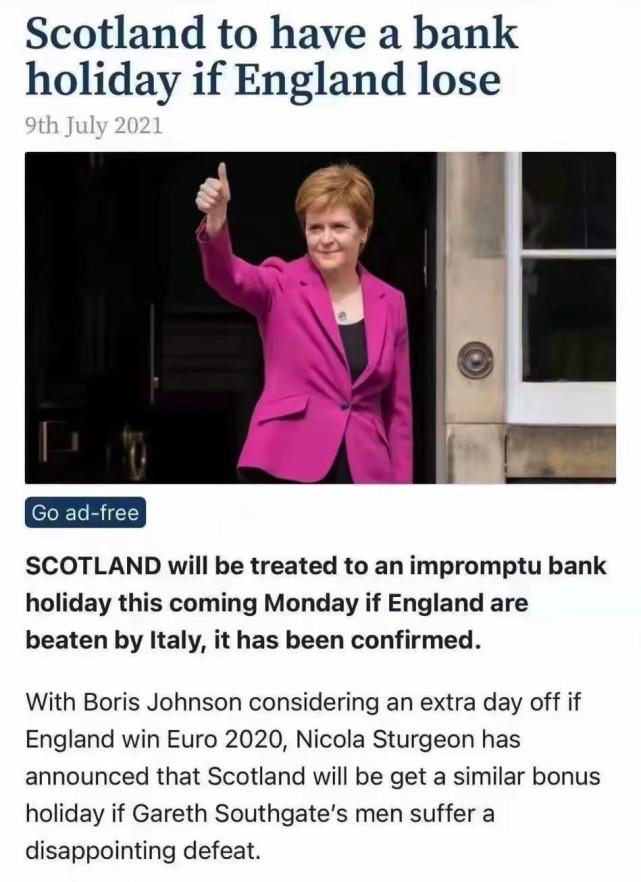 此前英国首相鲍里斯-约翰逊曾考虑过一项议案,若英格兰夺冠即将次日当作公休,全国放假一天。而随后苏格兰首席大臣尼古拉-斯特金针锋相对的表示,如果英格兰在决赛中输球,那么苏格兰将会在次日获得类似的公休假期。外媒表示,如今英格兰“如愿”丢冠后,苏格兰很有可能会将斯特金大臣的这项提案,付诸实施,因为这代表了广大苏格兰人民的民意。