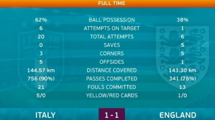 直播车讯 今天凌晨,意大利在欧洲杯决赛中点球击败英格兰,夺得队史第二座欧洲杯冠军,以下为两队本场比赛的数据对比。