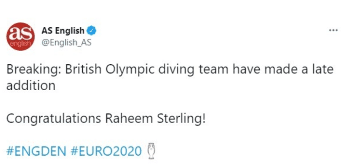 意大利记者帕尔梅里发推写道:“足球要‘跳’回家了(it's diving home)。”嘲讽斯特林跳水。