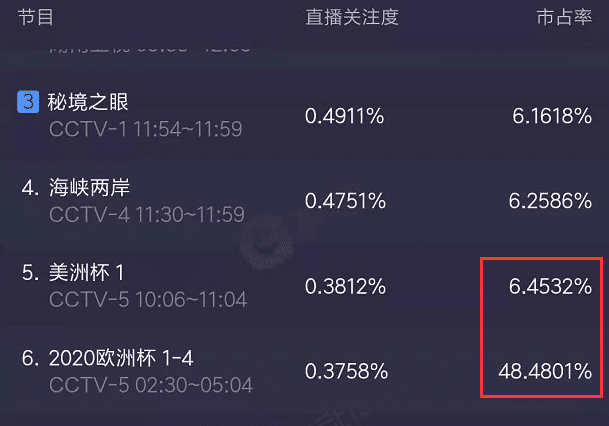 英格兰队的比赛是在北京时间凌晨3点开球,阿根廷队的比赛是在早上9点开始,根据数据统计,在电视台,英格兰队的收视率是0.37,美洲杯阿根廷队的比赛收视率是0.38;时间长的原因导致英格兰队的收视率不如阿根廷队。看起来阿根廷队稍微领先一点,但看看市场占有率,英格兰队的比赛高达48.48%,而阿根廷队的比赛市场占有率只有6.45%,差距巨大。