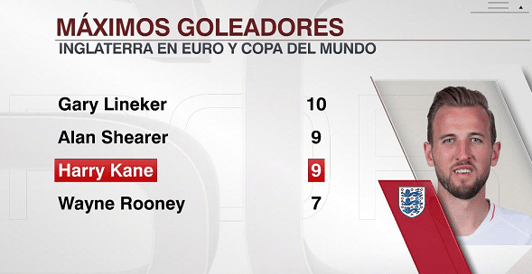 凯恩在国际大赛为英格兰打入9球,超越7球的鲁尼,追平9球的希勒,逼近队史第一10球的莱因克尔;
