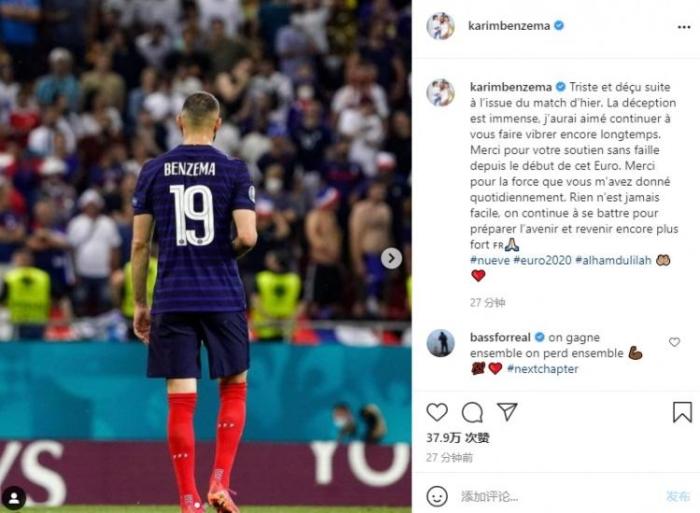 本泽马写到:“对昨天比赛的结果感到伤心和失望。巨大的失落,本希望能够让大家激动、兴奋很长时间。感谢大家自欧洲杯开赛以来一直的支持,谢谢每天带给我无限力量。没有什么是容易的,我们会继续战斗为未来做准备,更强大的回来。”