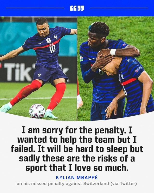 直播车讯 今天凌晨,法国在欧洲杯1/8决赛的点球大战中爆冷遭到瑞士淘汰,罚丢点球的姆巴佩在赛后接受了媒体采访。